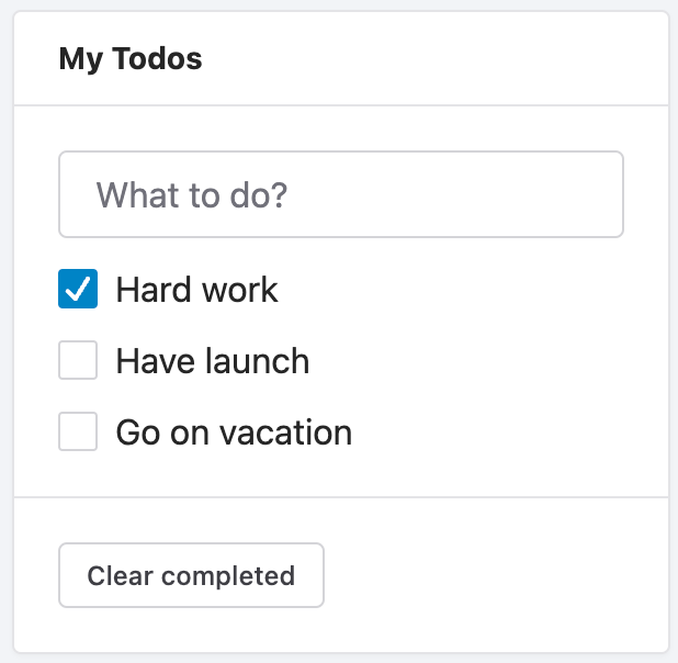 但是,clear 按钮并不会按照您的预期工作,它只会清除初始时 done: true 的 Hard work。如果用户点击完成了其他待办事项,再点击 clear 按钮它们将不会被清除。